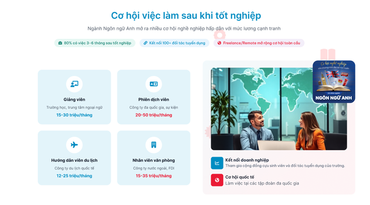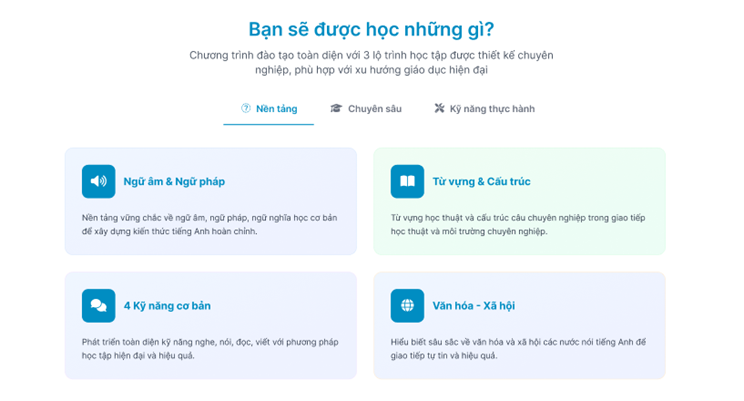 Phần "Tổng quan chương trình" trình bày 3 điểm chính với icon tích xanh về chuẩn Bộ GD&ĐT, lịch học linh hoạt, không ghi hình thức đào tạo. "Mục tiêu chương trình" liệt kê 4 bullet points về kỹ năng đạt được: ngôn ngữ, ứng dụng công nghệ, xây dựng lộ trình.