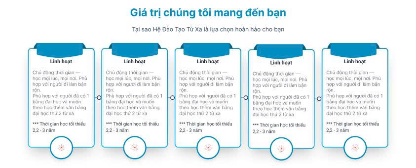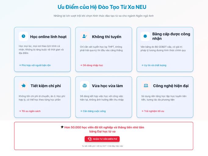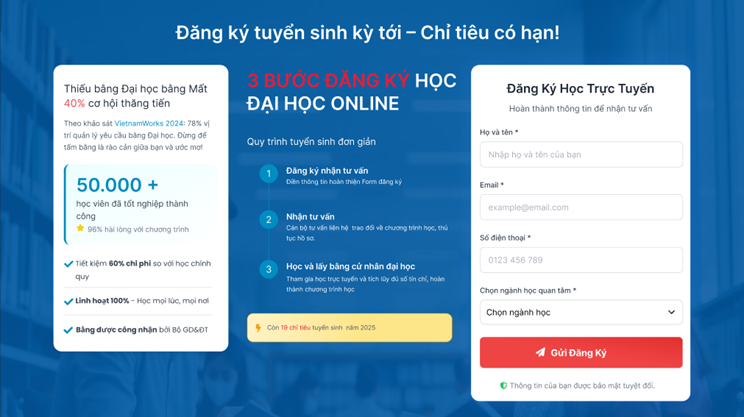 Hero section bố cục 2 cột: bên trái tiêu đề "ĐẠI HỌC TRỰC TUYẾN - HỌC TỪ XA" với slogan mạnh mẽ và 4 lợi ích có icon tích xanh. Bên phải form đăng ký nhanh với nút CTA màu đỏ nổi bật. Badge "50,000+ SV" tạo social proof, giúp chuyển đổi ngay 5 giây đầu.