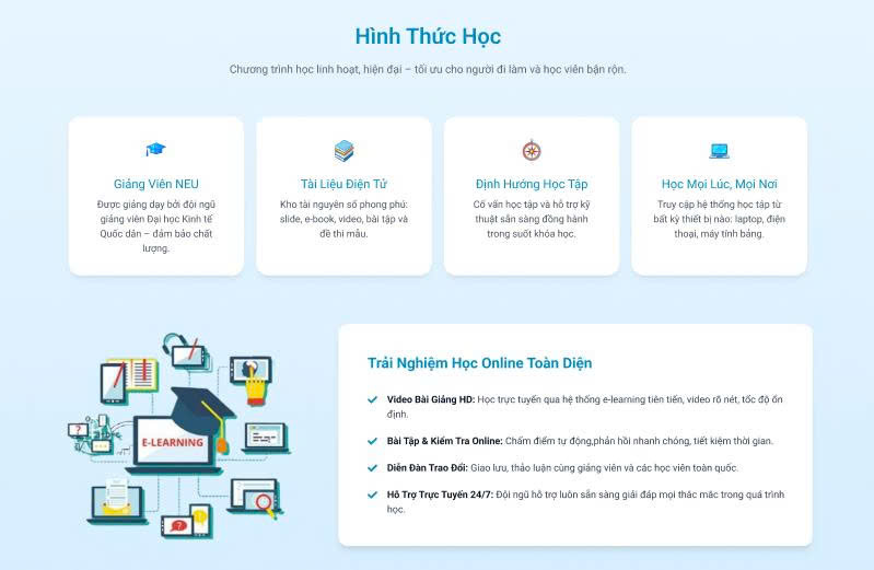 Section "Trải Nghiệm Học Online Toàn Diện" với illustration e-learning bên trái và 4 điểm nổi bật bên phải: Video HD, Bài tập Online, Diễn đàn, Hỗ trợ 24/7. Icon tích xanh và mô tả chi tiết giúp khách hàng hình dung quy trình học rõ ràng.